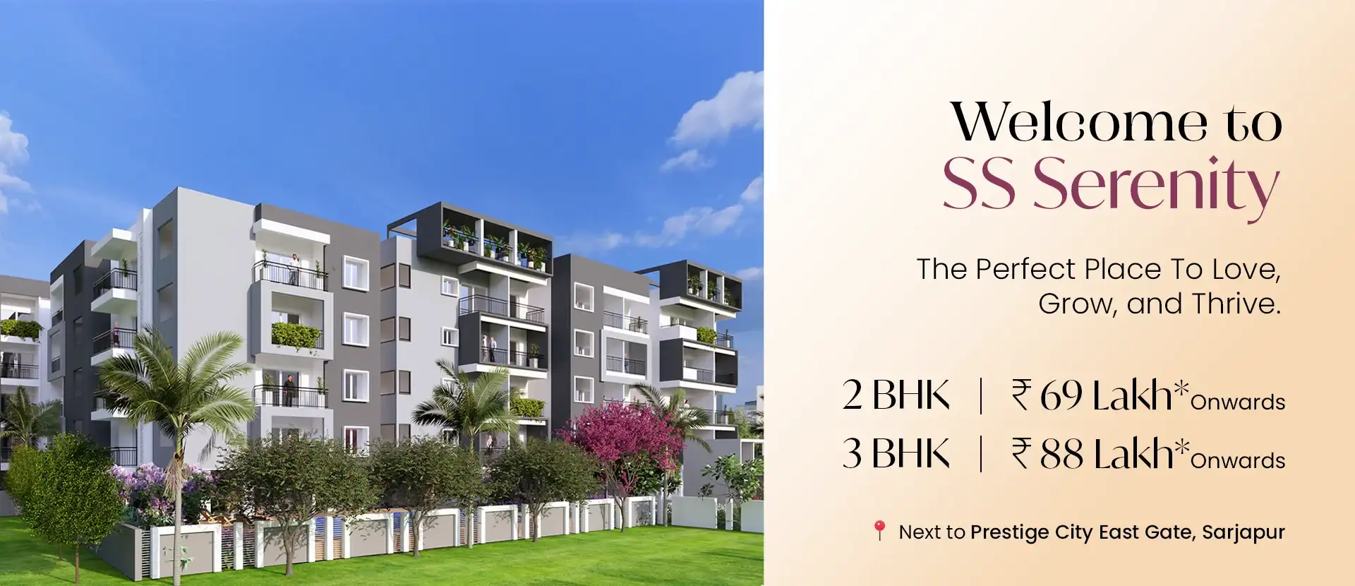 Located in the heart of Sarjapur Road, next to Prestige City East Gate, and just a short walk from the Sarjapur Bus Stop, SS Serenity offers unmatched accessibility paired with peaceful surroundings, making it a serene retreat you can call home.